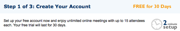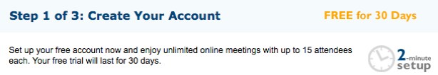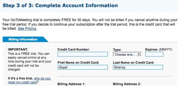 Having very good experience with GotoMeeting in my past job, I decided to try out their free 30 day trial. It said “FREE’ all over the place and so I started signing up.