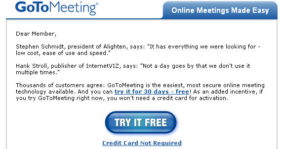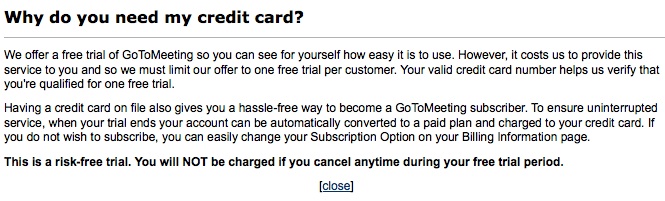 I understand that there are many vendors that do require a credit card for a free trial – magazine subscriptions, NetFlix, credit card protection services, travel insurance etc – but these are more of transactional or consumer facing applications. Goto Meeting to me is a B2B application, so why not trust your prospects?