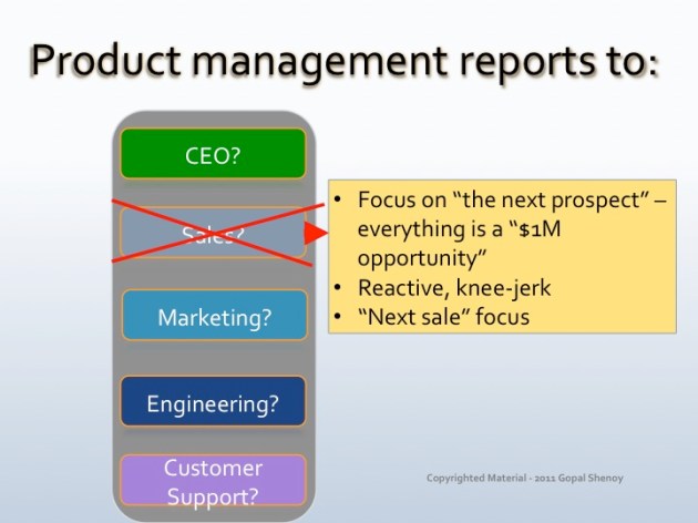 In an organization, where should product management report to? Sales? Marketing? Engineering? CEO? Customer Support? All of this is possible but where can it be the most effective?