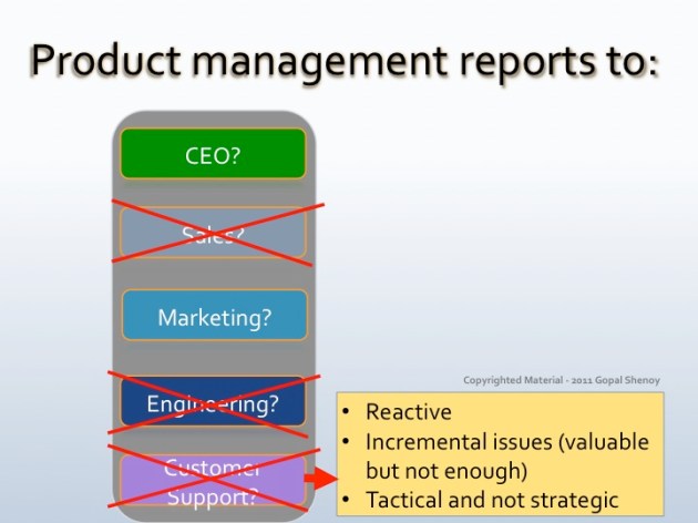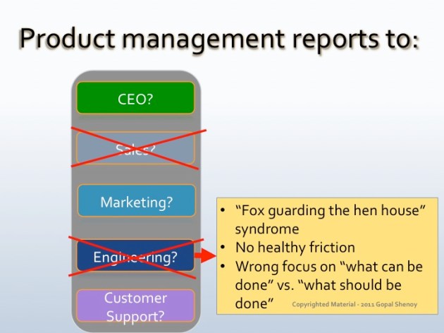 The slides shown below are my opinions on why it should not report into sales or engineering or customer support.